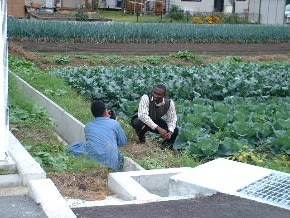 写真左:堀金の取水制限システム 写真右:緑豊かな農作物をバックに写真撮影する研修生