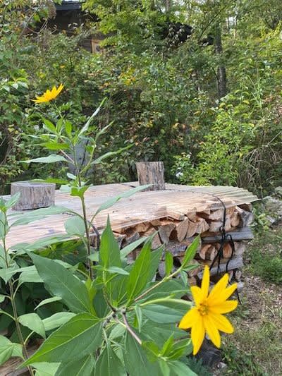 てんやわんやの作品はこれ。ひとまず今日は入口のペグの上に角材で押さえてある。