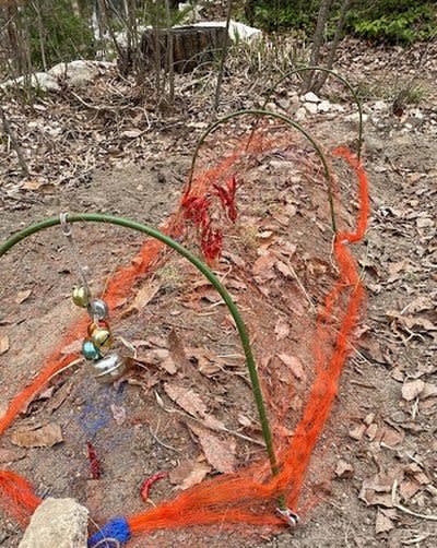 地面では寒冷紗などを押さえるペグ(見本)を利用する。