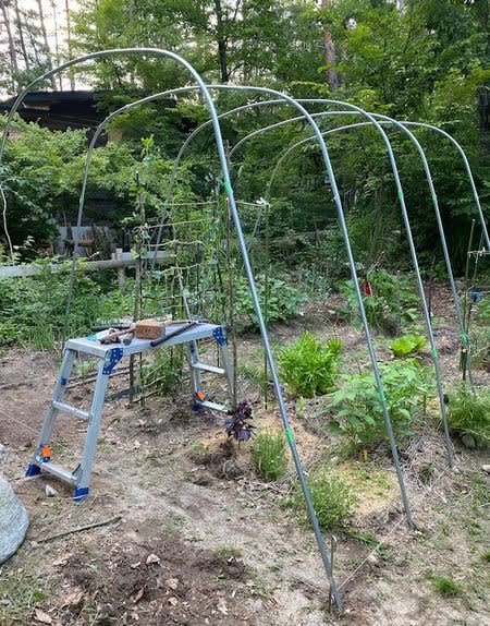 2日日は残り3本の支柱立てと横通しを設置して完成。地上サイズは周囲1640㎝高さ215㎝のゆるめのアーチ。