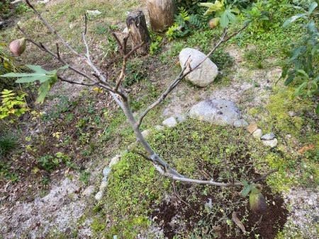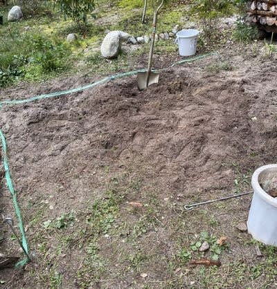 1日目午前中:予定地のサイズを東西2.4m 南北2.1mとした。予想より狭い。一輪車の通行と、アキニレの木が良い感じに成長してきたので、移植したくない。