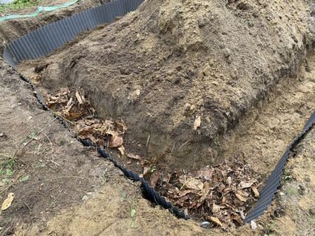 1日目午後:高さおよそ30㎝幅30㎝の土を掘り上げ、波板を差し込み石を敷き固定。ここは栽培時の通路にするつもりだが、この作業の必要性には疑問が残るなぁ。