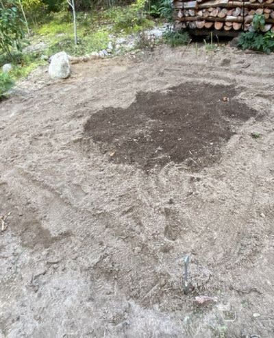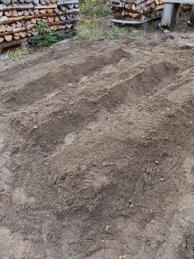 2日目:午前中、積み上げた土を側の空き地に広げたブルーシートに移動。大きな△山が出来た。
