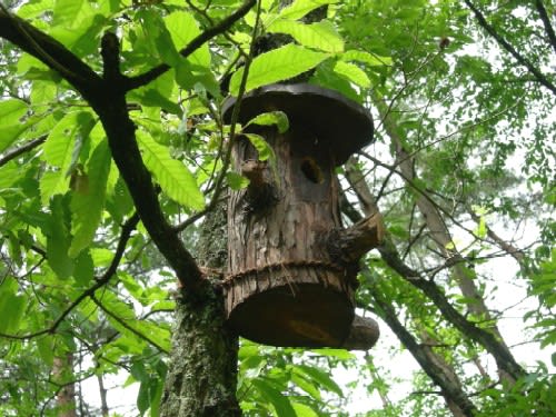 雨に濡れミズナラに囲まれた杉材の巣箱3号