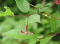 写真左:調べて判明したミヤマウグイスカグラ(ウグイスが啼く頃にラッパ型の花が咲く)