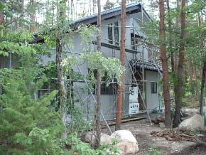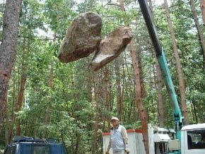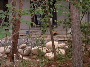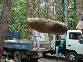 写真左:東側の浴室窓の目隠しを目的に選んだ場所からは、びっくりするほど大きな石と根っこをクレーンで搬出