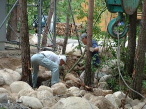写真左:中くらいの残した石を積んだり隙間に埋めたりして、窪みの壁面を強化する(棟梁と夫)