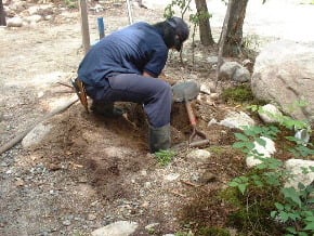 写真左:大きな石に挟まれ押しやられていた枝を保護する。現場用コンテナハウスを