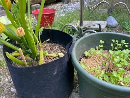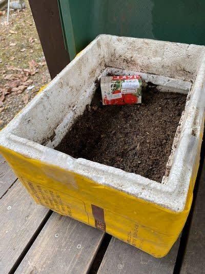 奥の数個の苗ポットは”種から栽培”の保険としてトマト・ナス・キュウリ・ピーマンを用意。