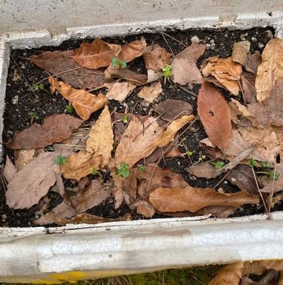 隣の鉢には畑の「ビタミン大根」の残り種を播いてみた。実は無理でも間引き菜が採れるでしょう。