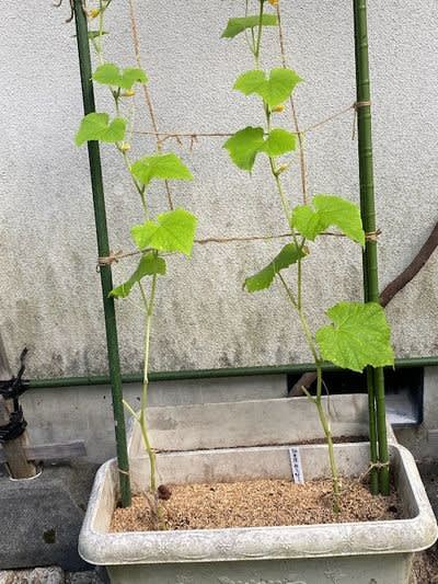 貧相なキュウリだが、お助けマンとして園芸店の苗を植えた。実がつくとは思えないが今後の参考にはなる。