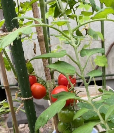 畑より悲惨だった中玉トマト。「もうピクルスにするよ!」と悪口たたいたら1週間前あたりから色づいてきた。