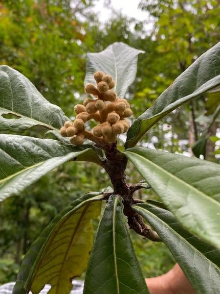 みるみる成長し主にビワ茶に利用していたが、昨日朝見上げた枝先端に。