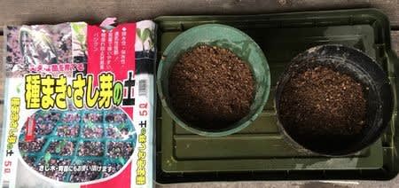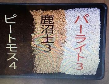 土はこの配合が良いらしいが、パーライトがなかったので種まき倍用土で代用する