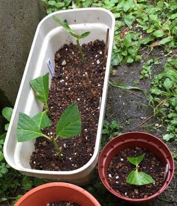 こちらはすでに1メートルほどに成長しており、2メートルの竹支柱まで用意したが、てっぺんがしおれて折れてしまった。