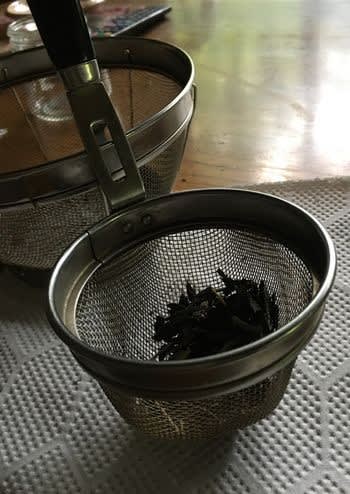 細目ザルではと味噌とき(手前の画像)でふるいをかける。細かすぎて落ちない。奥のザルならちょうどよい加減だった。