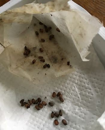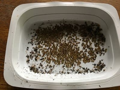 春に咲いたレンゲソウの鞘を乾燥させていた。いよいよ種の取り出しだが、何せちっこい!ダイコンやニンジンに似る。