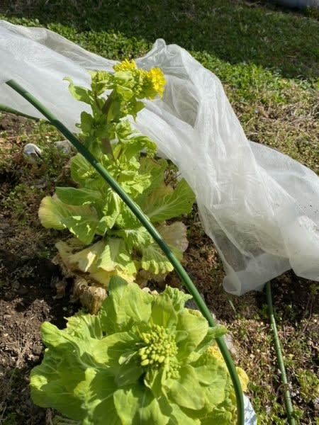 1週間ほど前に見つけた昨年のハクサイに黄色い花がついている。これにも寒冷紗を外さずに掛けておいたら・・・・