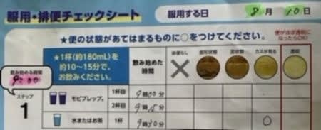 前回は初めてなので入院したが、今回は自宅で前日夜の下剤を飲用し、翌日朝から病院の休憩室でちびりちびりと配合内用材「モビプレップ」を、約2時間かけて飲用。