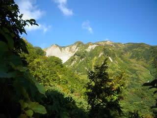 9寺15分 荒菅沢着。晴天に高くそびえるのが雨飾の頂上らしい