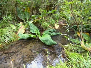 木道そばの湿地帯。この向い側の沢水には小さなイワナが泳いでいた
