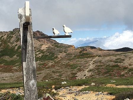 ハイマツ地帯に入り期待通りライチョウに出会う。悪天候時は天敵に狙われにくいので、ハイマツから出てくる確率が高いのだそうです。