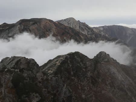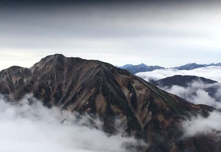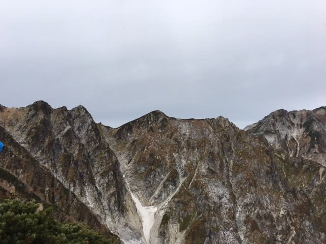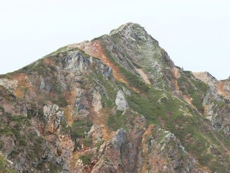 左の3ツこぶの右側切れ落ちているのが有名な不帰キレットですって。時に墜落事故があるところ。(これは6日9:30私の撮影分)