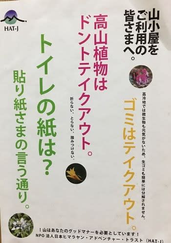 とうとう「館内のお客様から恐怖を感じるとクレームが出ています」と注意を受ける。のんき者の私は、体調万全の上で登山にきているだろうし、では就寝時は個室で1人を確保しているかといえばそうではないしなぁ。山でクラスター発生のニュースも聞かないし。案の定同室だったガイドさんは「大声の雑談にまた注意されていた」とのことでした。
