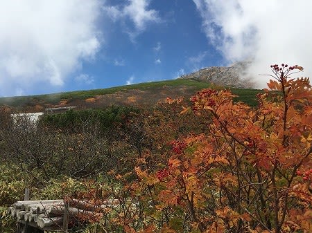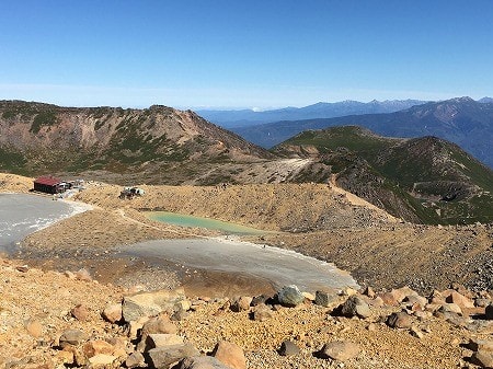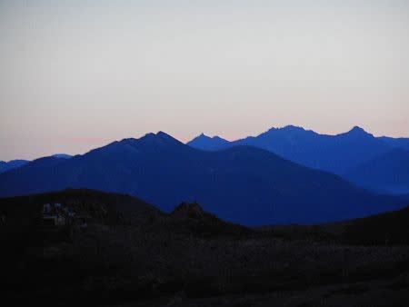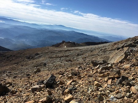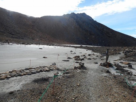 このロッジから右方向の吊り橋からスタートし、手前の森と中央の山の間を歩き、