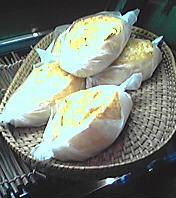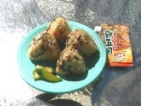 写真右:日本から持参の鶏五目(乾燥具)+塩昆布+レンゲ米で炊き込みご飯のおにぎり