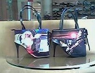 写真左:ショーケースの中のハイヒール型バッグ。左はM・モンロー、右はE・プレスリー?