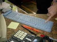 写真右:ぺったんこのキーボード(高さ1㌢強・親切にも販売店の道順を教えてくれた)
