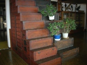 写真左:アプローチは塩川(塩味はしない)を渡って 写真右:階段の踊り場には壁一面に釣人の魚拓