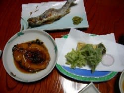 てんぷら、鯉のあらい、鯉の甘露煮、味噌汁、漬物など