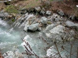 写真左:川は清く 写真右:山は深い(バス車内から)