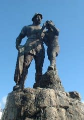 駅前に北アルプスの険しさと登頂の喜びを象徴する親子像