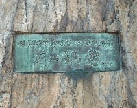 写真右:背面の銘板。土台は約2メートルくらいあり、ゴツゴツした石の肌が北アルプスの