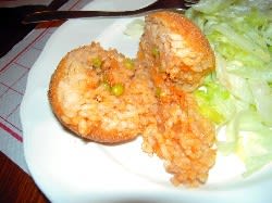 野菜やチーズや米をサフラン味で炒め、丸めパン粉をまぶして揚げたもの