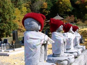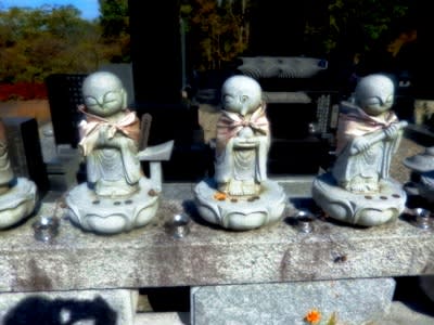 そばにある六地蔵のhidariから3番目の子だけ、北アルプス方面有明山を眺めています。