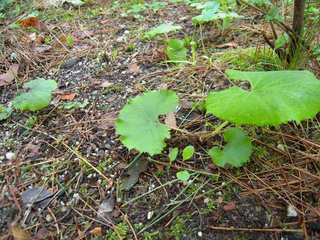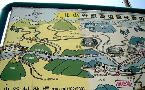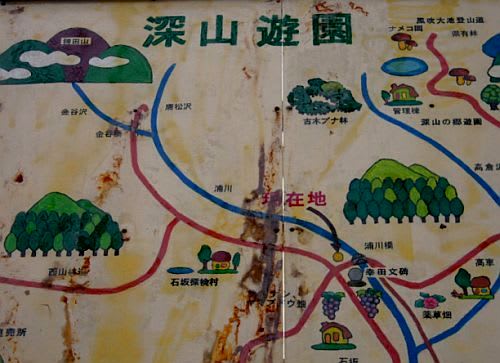 5月初め、近くをトレッキング中に見つけた看板。左上の紫色表示が崩れた山
