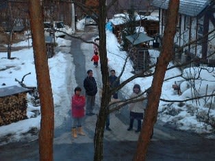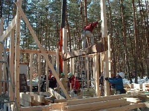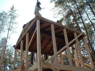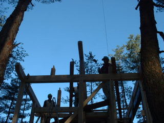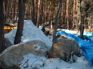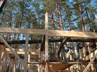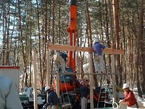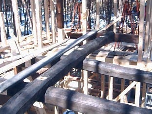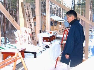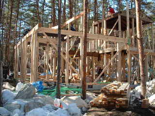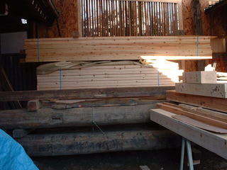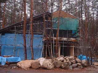 写真右:片流れの下方から見あげる。光の加減でしょうか、波うってみえますが、とんでもない!縦横斜めスカッと並んでいます。