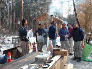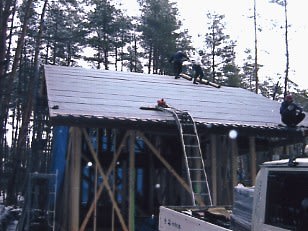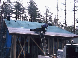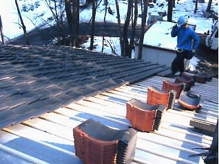 写真右:瓦が止めつけられてゆきます。軒先・袖はステンレスビス50ミリ、平部桟・平部雪止めはすべてステンレス釘50ミリを使用しています。